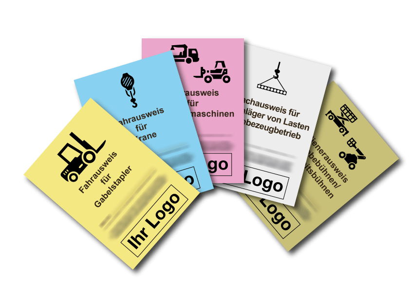 Bereits ab 100 Stück je Sorte personalisieren wir die Fach-/Fahr-/Bedienerausweise kostenfrei mit Ihrem Logo!